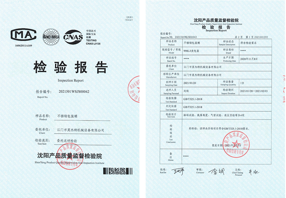 全部采用不銹鋼SUS304,包裝桶內(nèi)無衛(wèi)生死角。內(nèi)表面電解拋光,外表面鏡面拋光,效果達(dá)到8K。根據(jù)客戶要求刻印編號等內(nèi)容。包裝桶設(shè)計(jì)壓力0.6MP,設(shè)計(jì)溫度80C。檢測壓力0.35MP,時間>4小時。