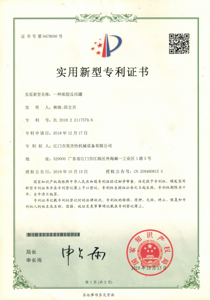 濃膠反應(yīng)罐專利證書